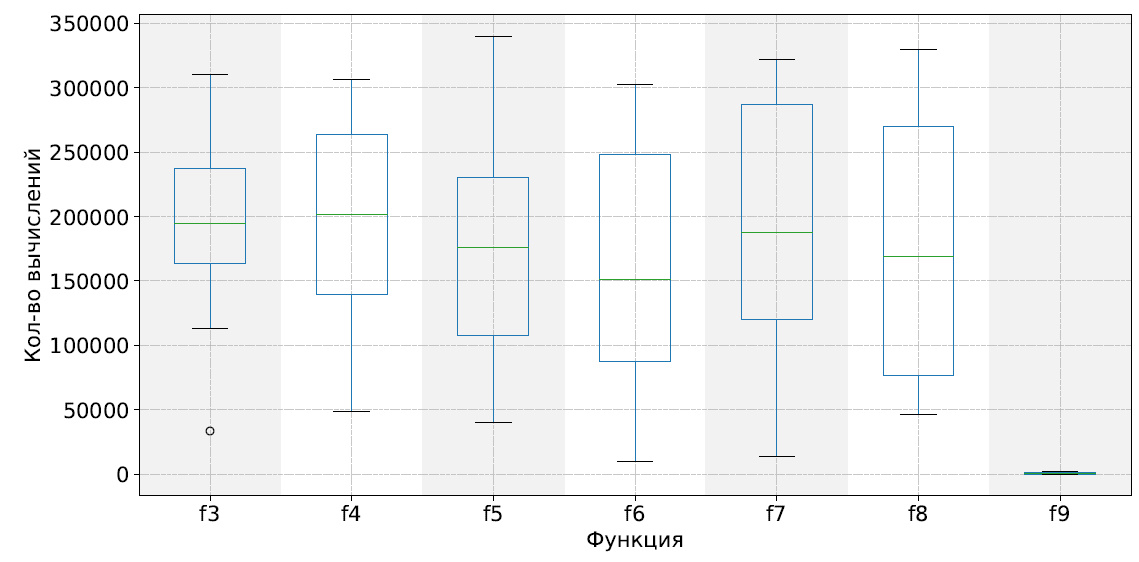 Рис. 5. Диаграммы межквартильного размаха для функций f 3–f 9. По оси ординат показано количество вычислений целевой функции. Результаты получены с использованием стандартного генетического алгоритма