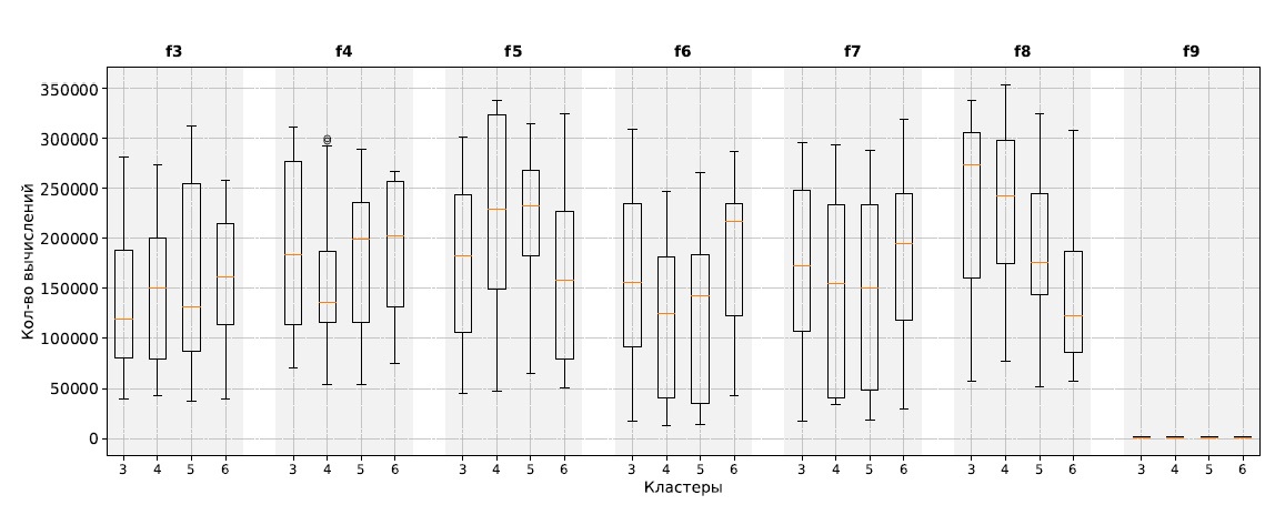 Рис. 6. Диаграммы межквартильного размаха для функций f 3–f 9. Каждый столбик соответствует числу кластеров (3, 4, 5, 6), сгруппированных по функциям. По оси ординат показано количество вычислений целевой функции. Результаты получены с использованием стандартного генетического алгоритма с модификацией, предложенной в настоящей диссертации