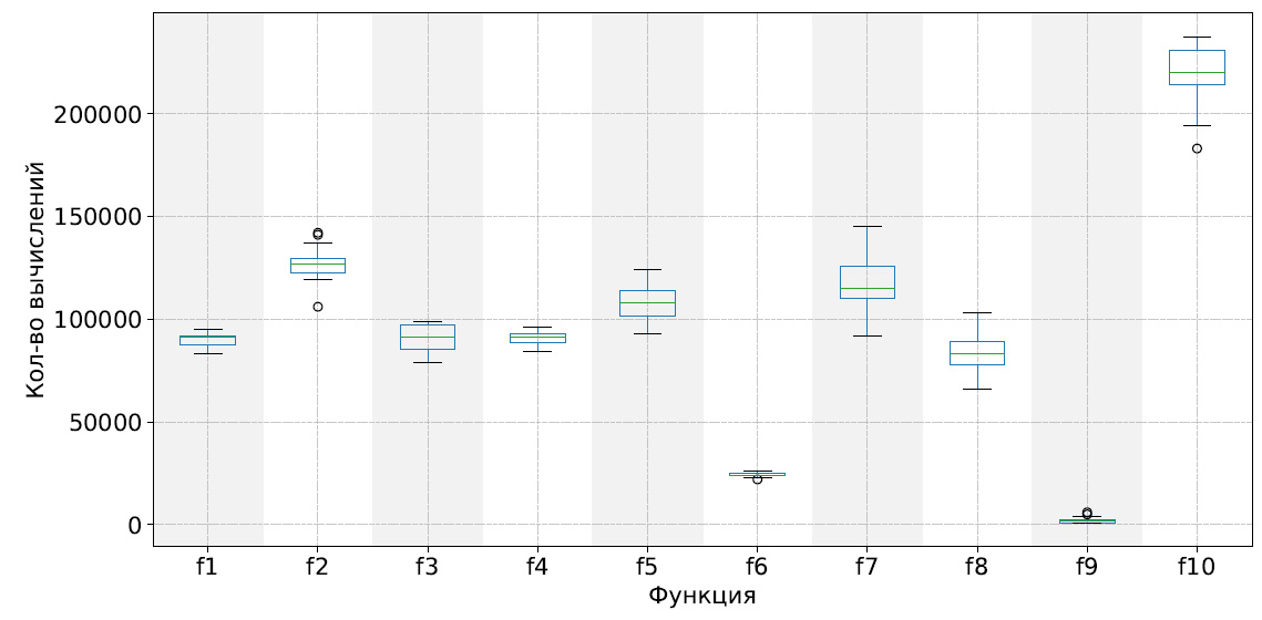 Рис. 7. Диаграммы межквартильного размаха для функций f 1–f 10. По оси ординат показано количество вычислений целевой функции. Результаты получены с использованием алгоритма SelfCSHAGA
