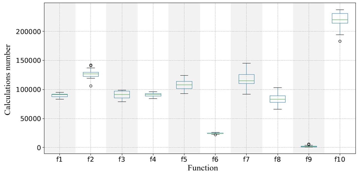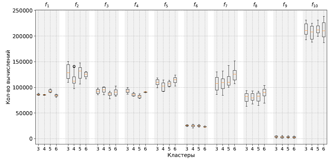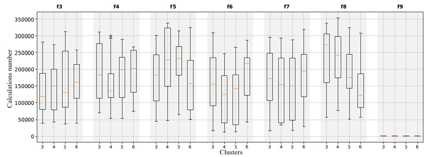 For example, the functions f 3–f 8 demonstrate high median values and interquartile range widths, which indicates scattered consumption of computing resources. The algorithm variant with the modification proposed in the dissertation, including K-means clustering with 3 to 6 clusters, made it possible to reduce the dispersion of the number of evaluations and shift the median towards smaller values. Thus, the generation of individuals within clusters ensured a directed distribution of the search across the solution space, which reduced the number of evaluations required to achieve an approximate optimum.