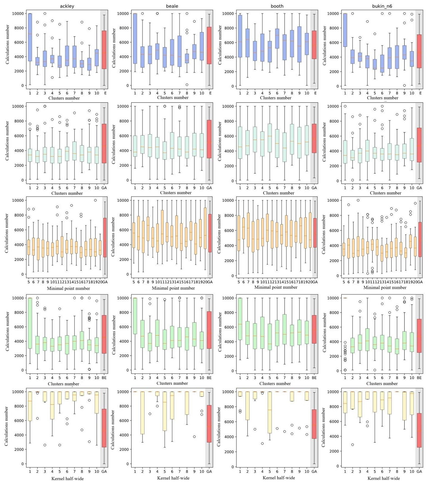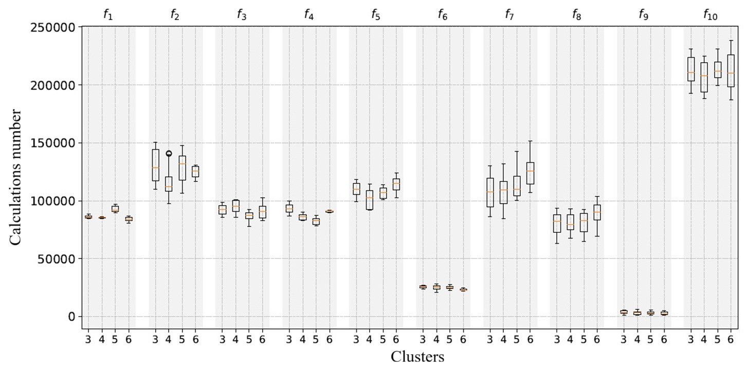 It can be seen from Table 1 that in most cases, the smallest number of evaluations of an objective function is achieved with 3–4 clusters, especially for low dimensions. For high dimensions, the effect of the number of clusters is less clear-cut, but the range of 3–6 clusters remains effective.