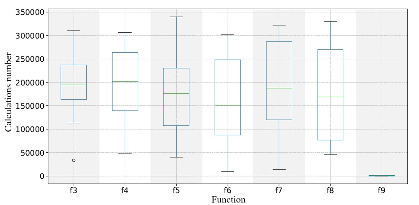 The use of K-means clustering (number of clusters from 3 to 6) further reduces the spread of calculations. By distributing the population across clusters, the algorithm explores solution space more effectively, especially for the functions with high computational complexity (f 3–f 8), reducing the number of iterations required to reach an approximate optimum and narrowing the interquartile range. For example, for the f 5 and f 7, the modified algorithm consumes significantly fewer computations than the standard SHAGA, while the IQR is reduced reflecting the more predictable and economical operation of the algorithm.
