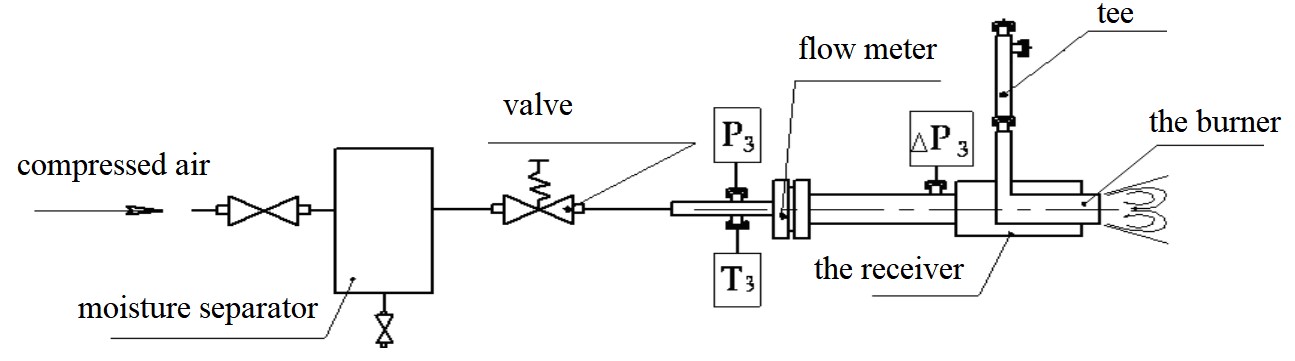The test bench operates as follows: air from the network enters a moisture separator and an electromagnetic valve, which regulates the air flow rate to the burner. A critical nozzle is used as a flow meter. Air pressure and temperature are measured upstream of the nozzle. The pressure drop upstream of the burner is determined, at which point the throughput is measured.