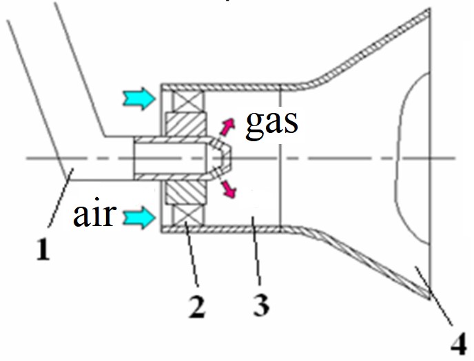 Fig. 7. Scheme of the burner device of a serial KS: 1 – jet nozzle; 2 – swirl; 3 – mixing chamber; 4 – nozzle attachment