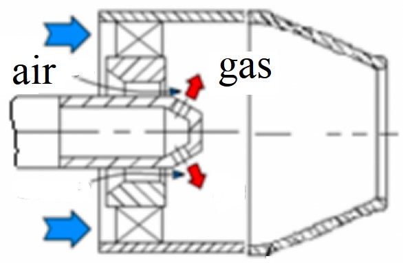 To ensure stable operation of the combustion chamber across the entire range of operating modes, the burner is designed as a dual-circuit burner. Fuel gas enters the airflow through openings in the swirler blades (the main circuit) and flows through the interblade channels, forming a well-mixed fuel-air mixture at the burner outlet.