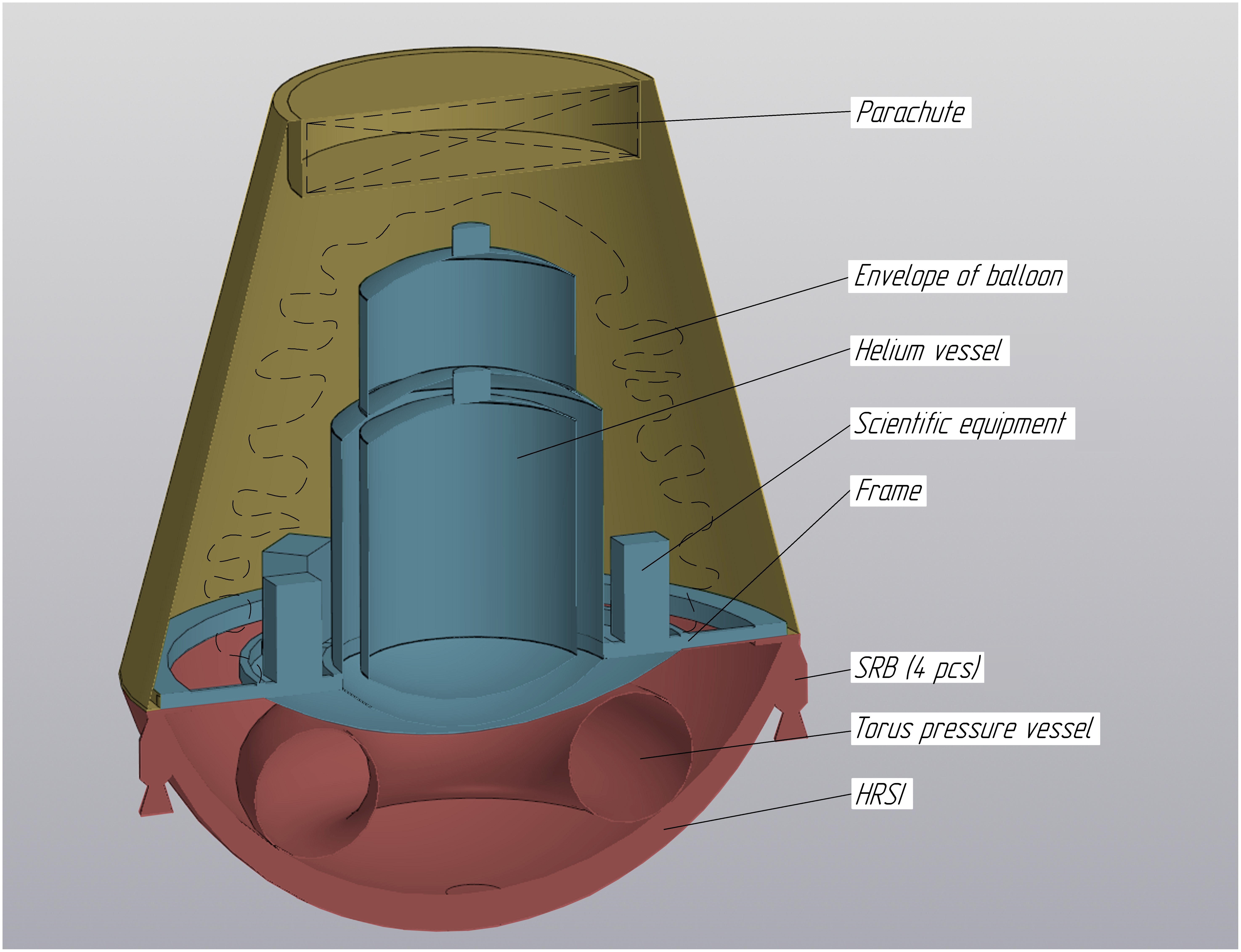 The design of the probe requires it to remain in the Venusian atmosphere at a certain altitude for a sufficiently long period (approximately 100 days) while maintaining optimal operating conditions. To maintain the apparatus's viability, it is necessary to develop a helium refueling system for the balloon, which leaks at a rate of approximately 2.5 % per day.