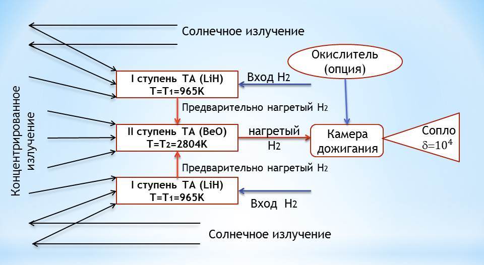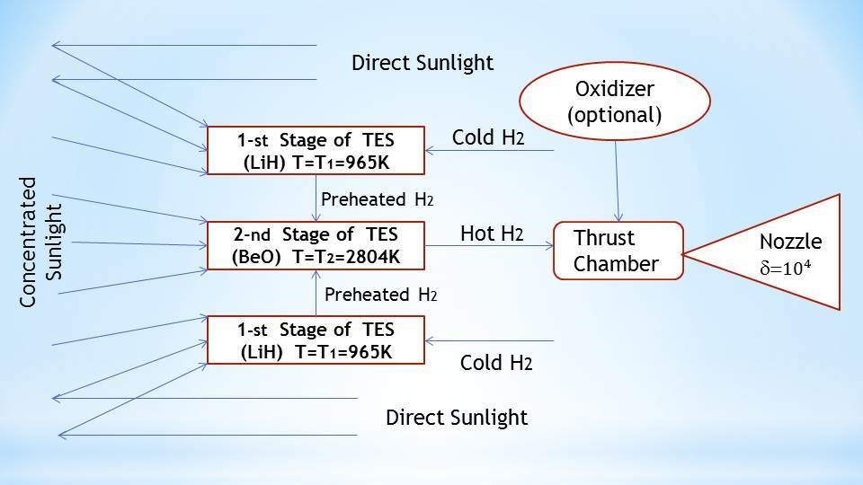 Fig. 1 shows the STRE diagram with two stages of heating of the CATS system. Hydrogen is initially heated to the melting point of lithium hydride (961 K) in the peripheral region, and then, in the second stage of the TES, it is further heated to the final melting point of beryllium oxide (2804 K). Heated hydrogen, when expanding in the nozzle, creates thrust P, which, in combination with the thermal discharge time of the accumulator tprop, provides a single thrust impulse Isingle= P·tprop at each active section, depending on the specified time of the interorbital flight.