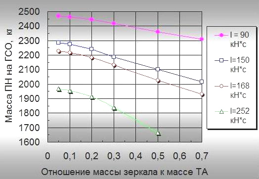 Рис. 3. Зависимость массы КА на ГСО от отношения массы концентратора к массе двухступенчатого теплового аккумулятора с ТАМ на основе LiH+BeO
