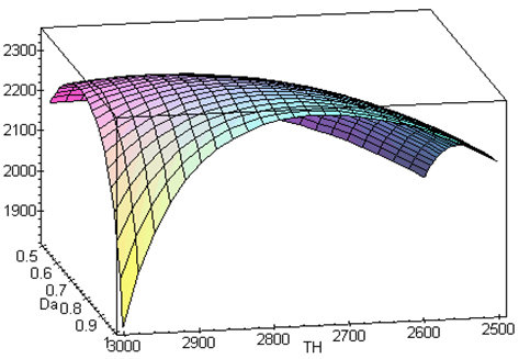 Fig. 4 shows the 3D-dependence of the payload mass on the temperature of the central stage and the parameter Da for the case of ТS = 60 days, this results in the possibility of a certain change in these values in a fairly narrow range with an insignificant change in the useful mass output to the GEO, which makes it possible to vary, for example, the accuracy parameter, at subsequent stages of engine design.