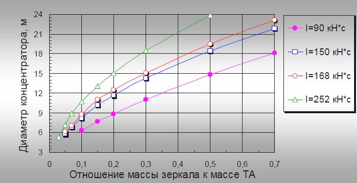 The problem of choosing the accuracy parameter of the concentrator Da is a compromise between the conflicting requirements for the size of the concentrator and its specific and total mass, since a decrease in the parameter Da leads to an increase in the efficiency of the light receiver and, as a consequence, a decrease in the area of the mirror, but, at the same time, to a nonlinear increase in its specific mass. On the other hand, an increase in Da leads to a decrease in the actual temperature of the hydrogen at the outlet, which determines the specific impulse of the engine and the mass flow rate of the heated gas, and to ensure constant thrust it is necessary to increase the size of the mirror, and a decrease in its specific mass, on the contrary, should reduce the total mass of the CR system. Therefore, it is advisable to use the “concessions” method here – to determine to what extent it is required to increase the energy efficiency of the engine given design, technological, operational and other limitations. We should also take into consideration the relationship between the accuracy of the mirror and the requirements for precision tracking of the solar system by the CATS.