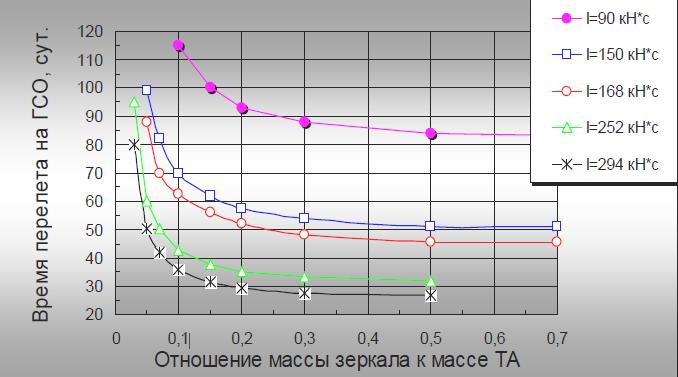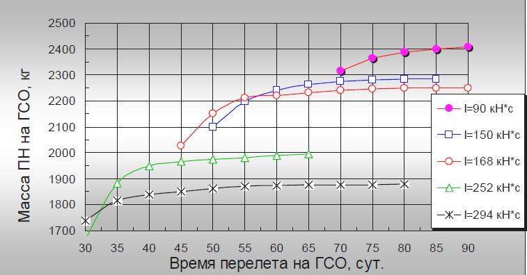 Rational combinations {Isingle,[p]} have been defined for the duration of a multi-impulse flight from LEO to GEO from 20 to 90 days, within the limits of a single thrust impulse Isingle = 90–390 kN·s and the parameter [p] = Mк/Mа =0–1–0.3. For these values, the main reasonable propulsion characteristics are presented. The obtained results show that the time of launching a payload into geostationary orbit using a STP in 20...90 days is the most preferable between the duration of a flight with chemical engines and an electric rocket flight, including schemes with the spacecraft “orbit raising” into the final orbit.