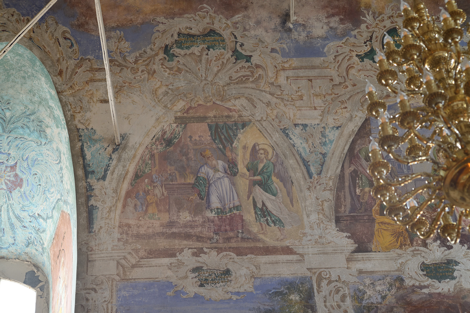 К северу от Успенской церкви находится храм Иоанна Предтечи. Живописные росписи в данной постройке появились в 1845 году. Ныне их художественная ценность неоспорима, но в середине ХХ в. считалось, что подобное живописное убранство не представляет значимой художественной ценности. К концу 1970-х гг. ситуация несколько изменилась, в путеводителях стали упоминать, что помимо нарядного декора фасада церкви существуют и росписи интерьеров [10, с. 67]. Первая реставрация церкви Иоанна Предтечи проводилась в 1959–1960-х годах. Вторая – происходит в настоящее время. Не все стенописи дошли до наших дней даже во фрагментированном состоянии. Некоторые места, вплоть до целых сюжетов, уничтожены. Наилучшая сохранность в сводах; полная утрата росписей наблюдается преимущественно в первых регистрах.