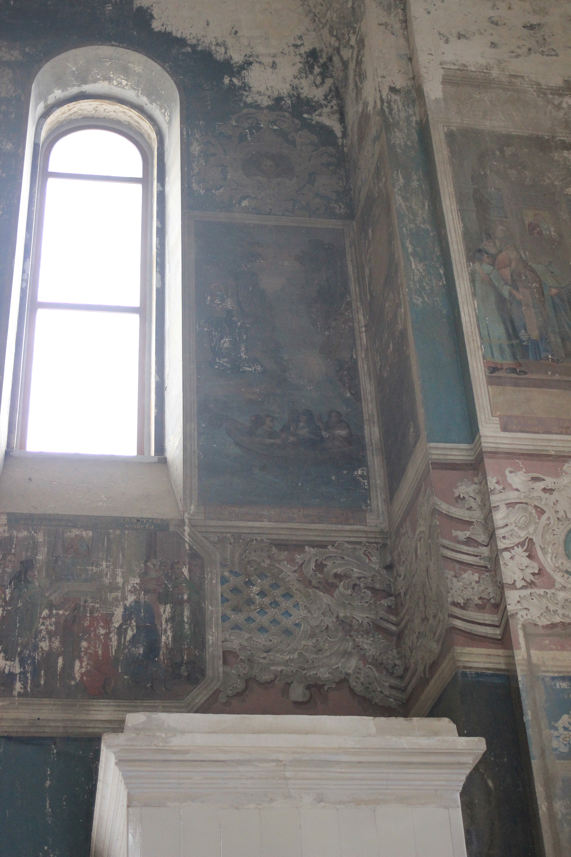 Стенная летопись, несмотря на утраты, позволяет прочесть, что храм заложили по благословению Преосвященнейшего Симеона, архиепископа Ярославского и Ростовского при игуменье Августе, а завершили при архиепископе Авраамии. Росписи интерьеров можно разделить на два этапа: в 1822–1824 гг. работы вёл художник Епифан Медведев, затем, в 1862 г., Егор Дьяков [6, с. 79-80]. В алтарной части размещалось изображение Тайной Вечери. В западной части храма мы видим сцену, изображающую Христа Благословляющего. Остальные стенописи в этой части практически полностью утрачены, можно различить только отдельные фрагменты.