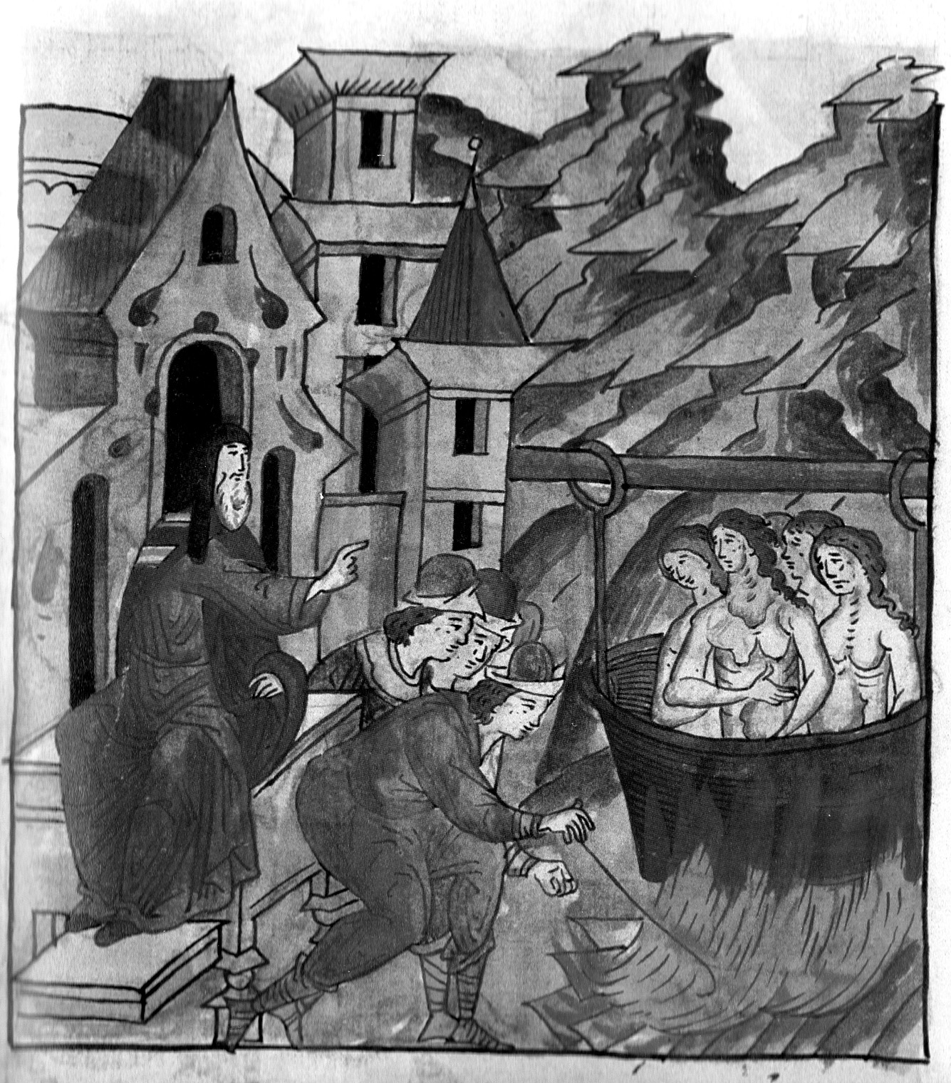 The Orthodox artist acknowledges the existence of evil but does not consider it to be the main element in the world. There is a disengaged attitude toward worldly events, viewing evil as a natural manifestation of the imperfect world, created by God but inhabited by sinful people. Orthodox artists tend to display self-deprecation and a general downplaying of human merit. In contrast, Western art, especially since the Renaissance, often glorifies man as the pinnacle of creation, where humans govern the world and nature and everything is subjected to their influence. Western artists employ various means, such as suppression, intimidation, seduction, and shock, to attract attention to their paintings. This can be seen as a form of direct “emotional manipulation,” dictating to the viewer what they should feel and understand, potentially stripping them of their freedom and turning them into spiritual slaves. Such tendencies are notably absent in Orthodox art. Old Russian artists, in particle, aim to “harmonize” the viewer through the images they create. They encapsulate the suffering and horror of the world within a “shell” of love and benevolence, allowing for independent assessment and creating a sense of standing before the image as an individual. When comparing Russian and European art from the 13th–17th centuries, a striking difference emerges. Works by Orthodox masters convey a life-affirming feeling of light and joy, whereas many European paintings emit an overwhelming, dark, ominous atmosphere. The question arises: How did Russian artists manage to convey this joy of life while acknowledging the dark sides of existence? After all, it is quite obvious that they knew the dark sides of life very well. Many scenes in the Illuminated Chronicles are literally “drenched in blood,” filled with suffering, horror, and death, starting with the suffering of Jesus on the cross. The manuscript also contains depictions of hell, bloody battles, beheading, boiling in a cauldron, and various other horrors associated with death (Fig. 3). However, even these bloody scenes do not evoke horror and disgust in the audience, feelings that are often experienced by viewers of the works of Hieronymus Bosch, Albert Altdorfer, Matthias Grunewald, Hans Holbein, and many other famous artists of Western Europe.