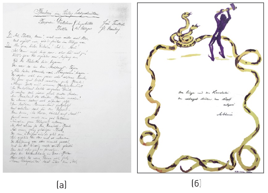 История любого издательства чаще всего складывается из комплекса документов, сохранившихся в нескольких архивохранилищах. Самыми информативными, как правило, являются воспоминания основателей или сотрудников фирмы, отчетная документация. Гораздо реже удается обнаружить исторический источник в стихотворной форме. Именно такой документ хранится в Амстердаме среди материалов Б.Н. Рубинштейна (опись № 5). Это шесть страниц рукописного текста на немецком языке, датированного декабрем 1920 г., с одним цветным рисунком, также выполненным от руки. Перевод и анализ текста позволил установить, что в нем приведена в краткой форме характеристика истории издательства с 1905 по 1920 год. Это стихотворный диалог в жанре одноактного скетча, посвященный пятнадцатилетнему юбилею учреждения, который в шутливо и непринужденно ведут между собой две сотрудницы фирмы. Причем свидетельства о большей части событий, произошедших в истории издательства, даны в иносказательной манере. Без знаний реальной истории предприятия достаточно сложно понять, о чем идет речь, поскольку текст предназначался для внутреннего употребления. Данный документ, как показали наши исследования [11], отражает подлинные события из истории «Издательства И.П. Ладыжникова», в том числе ряд щекотливых моментов, связанных с его созданием. К скетчу приложено поздравительное письмо из Лейпцига от одного из деловых партнеров фирмы3.