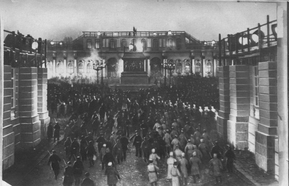 Декорация для комбинированного кадра «Взятие Зимнего дворца», рассчитанная для съемки на ней общих, средних и крупных планов, была выполнена художником Б. Дубровским-Эшке очень тщательно и с гораздо большим запасом площади стен дворца, чем этого требовал дальний план дорисовки. Этот запас обеспечил ряд совершенно новых точек, как бы раздвинувших еще больше размера кадра.