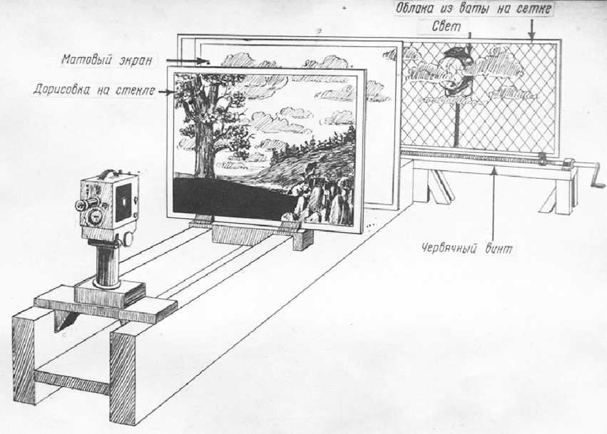 В этом отношении немалый интерес представляют опыт оператора М. Карюкова («Одесская киностудия») и студии «Мосфильм» (оператор Р. Степанов), студии «Детфильм» (оператор Алексеев)6, снимающего дорисовку на станке, соединенном или с кадровым рирпроектором, или с проекцией, получаемой на матовом стекле от автоматически перемещающихся за ним нескольких полупрозрачных плоскостей, дающих на стекле светотеневое изображение облаков.