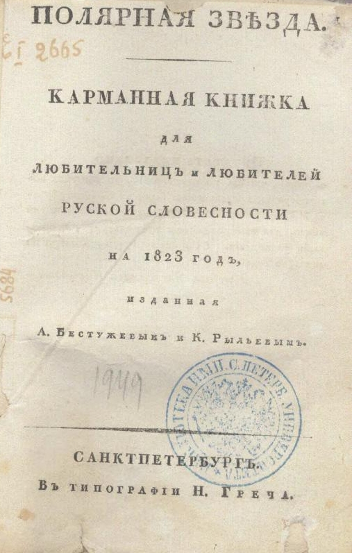 - Полярная звезда. Карманная книжка для любительниц и любителей русской словесности на 1823 год, / изданная А. Бестужевым и К. Рылеевым. Санкт-Петербург: Тип. Н. Греча, 1823. [2], 390, [4] с.