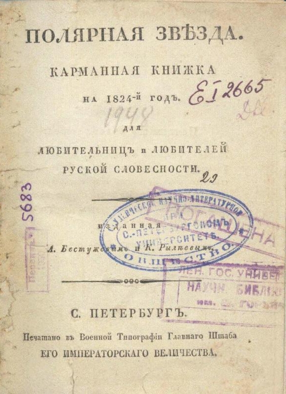 - Полярная звезда, карманная книжка на 1825-й год, для любительниц и любителей русской словесности. / Изданная А. Бестужевым и К. Рылеевым. Санкт-Петербург: Воен. тип. Главн. штаба, [1825]. VI, 376 с.; 2 л. ил. (5 экз.).