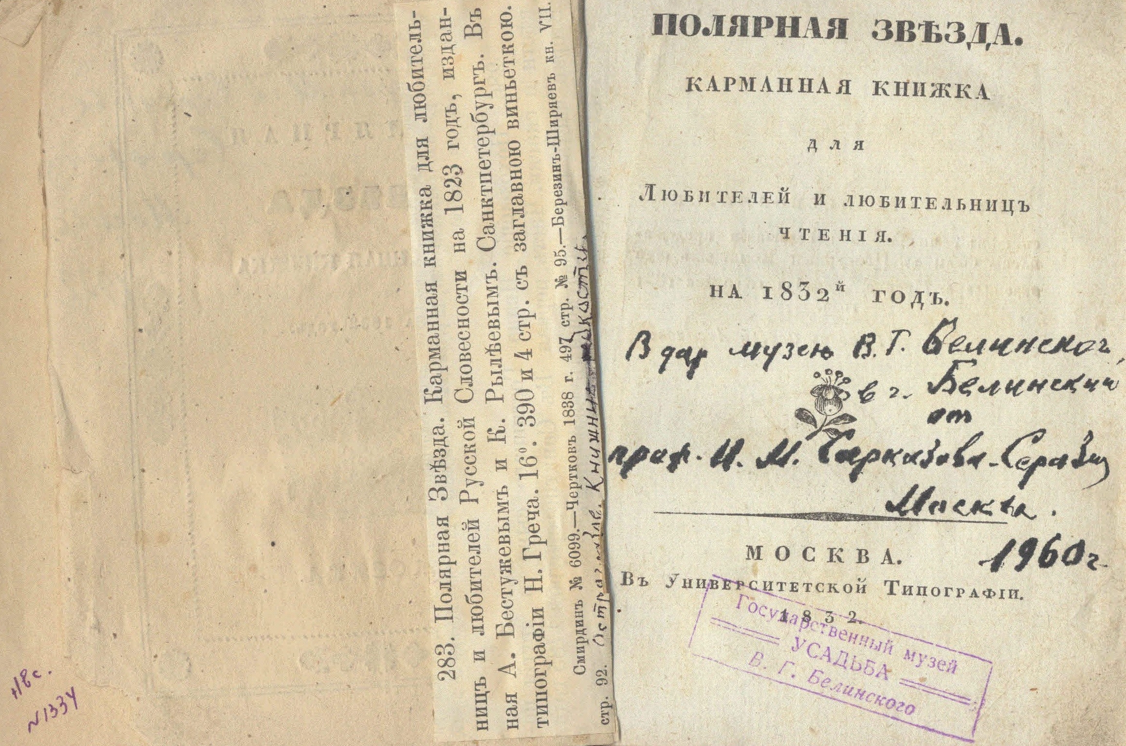 3 Например, на титульном листе альманаха «Полярная звезда. Карманная книжка для любителей и любительниц чтения. На 1832-й год» (Москва, 1832) сделана надпись чернилами следующего содержания: «В дар музею В.Г. Белинского в г. Белинский от проф. И.М. Саркизова-Серазини. Москва. 1960 г.».