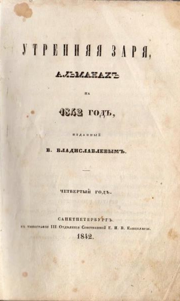 - Утренняя заря, альманах на 1842 год, / изданный В. Владиславлевым. Четвертый год. Санкт-Петербург: Тип. III отд-ния собств. Е. И. В. канцелярии, 1842. 372 с.; 6 гравир. л. портр.