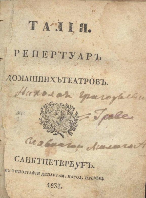 - Талия. Репертуар домашних театров. / [Изд. И. Сленин]. Санкт-Петербург: Тип. Департ. нар. просвещения, 1833. 240 с.; 3 л. ил.
