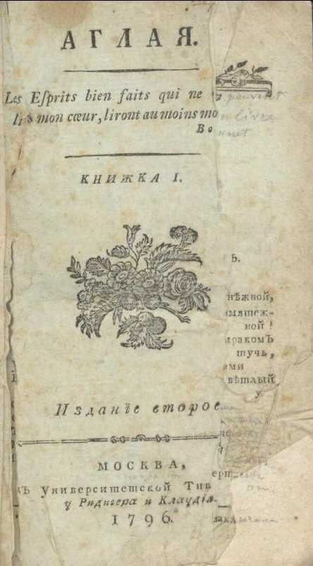 - Аглая. Кн. 1. 2-е изд. Москва: в Унив. тип., у Ридигера и Клаудия, 1796. 146 с.; Кн. 2. 192 с.