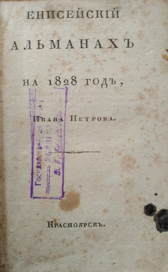 - Енисейский альманах на 1828 год, Ивана Петрова: [Проза и стихи]. Красноярск [Москва: Тип. С. Селивановского], 1828. [4], 4, 128, 92 с., 2 л. фронт. 2 л. ил., нот.