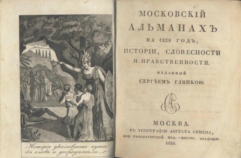 - Московский альманах на 1828 год истории, словесности и нравственности / Изданный Сергеем Глинкою. Москва: Тип. А. Семена, 1828. 239, IV с.; 3 л. гравир. ил.