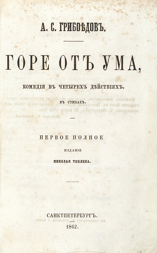 1 Грибоедов А.С. Горе от ума: комедия в 4-х д., в стихах. Новое доп. изд. [Санкт-Петербург]: Тип. Н. Тиблена и К°, 1862. 26 с.