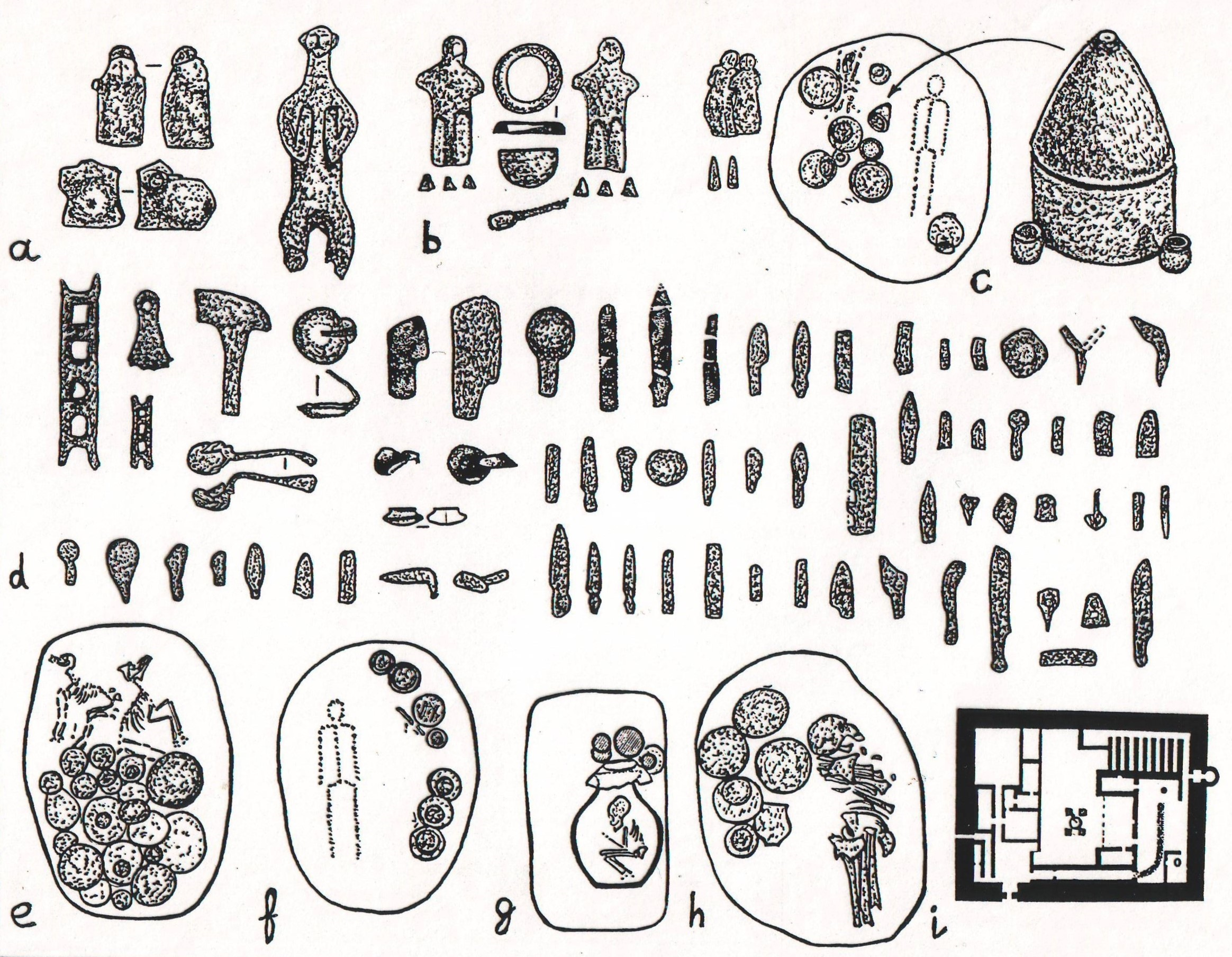 Ритуально-имитативные атрибуции известны и на североиранском поселении Тепе Гиссар (III). В так называемом «сожженном» здании обнаружен вотивный набор миниатюрных предметов. Р. Дайсон связывает появление подобных символов в погребальном инвентаре с возраставшим социальным расслоением общества [33, с. 91]. Весьма широко и разнообразно бронзовая ритуально-имитативная атрибутика представлена в археологических комплексах Луристана (конец II – начало I тыс. до н. э.). В храме Сурх-и Думб встречаются вотивные булавки, бронзовые пластинки с изображениями различных мифических сюжетов. В ряде погребений имеются ритуальные топоры, так называемые идолы-навершия вотивных штандартов, не использующихся в быту. «Люди изготовляли эти предметы и помещали их в некрополи, располагавшиеся у рек и ручьёв, в местах, которые до сих пор считаются священными» [9, с. 64]. Бронзовые модели лука и плуга обнаружены в могильнике раннежелезного века Марлик в южном Прикаспии (область Гилян). При этом имитация плуга с впряженными в него двумя быками входила в сопровождающий инвентарь могилы «царя-воина» [9, c. 61-62].