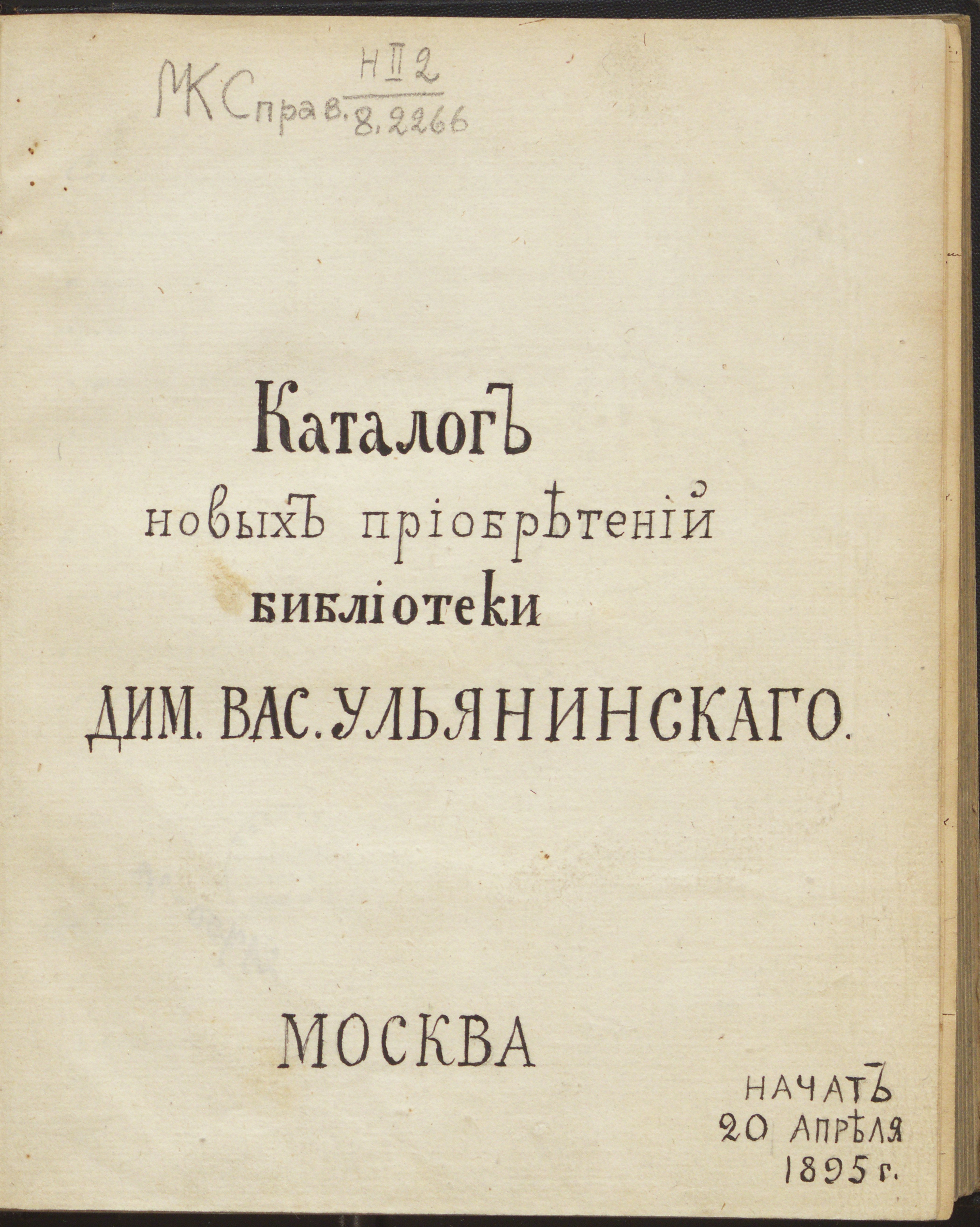 - Ul`yaninskij, D.V. Katalog novy`x priobretenij biblioteki Dimiitriya Vasil`evicha Ul`yaninskogo: rukopis` [Catalog of New Acquisitions of Dmitriy Vasilevich Ulyaninsky’s Library: Manuscript]. Vol. 1. Moscow. The Russian State Library. Department of Rare Books (Book Museum). Inventory No. 17821. (In Russian).