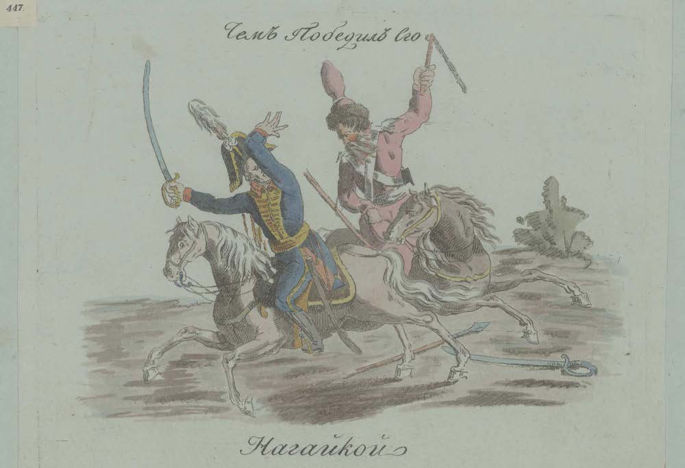 Рис. 1. Рис. и грав. И.И. Теребенев. Чем он победил врага своего? Нагайкою! Офорт, акварель. Изобр. – 20 х 32,5; лист – 30 х 40 см. Российская национальная библиотека