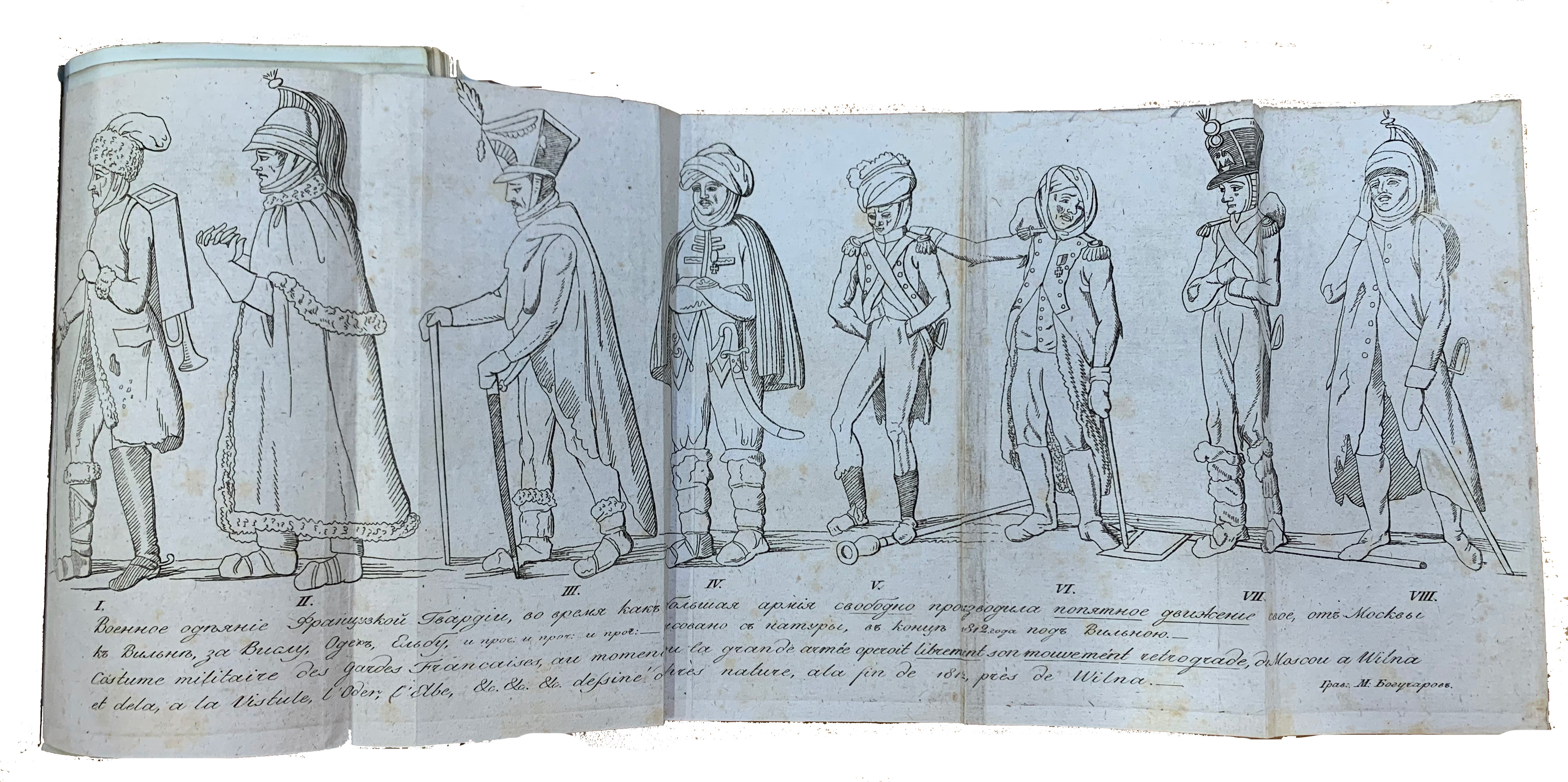 Рис. 6. Грав. М. Богучаров. Военное одеяние французской гвардии во время как большая армия свободно производила попятное движение свое от Москвы к Вильне за Вислу, Одер, Эльбу, и проч., и проч. и проч. («Сын Отечества», 1813 г., Ч. 5, № 19). Офорт, акварель. Лист – 43,8 х 18,3 см. Фото автора статьи