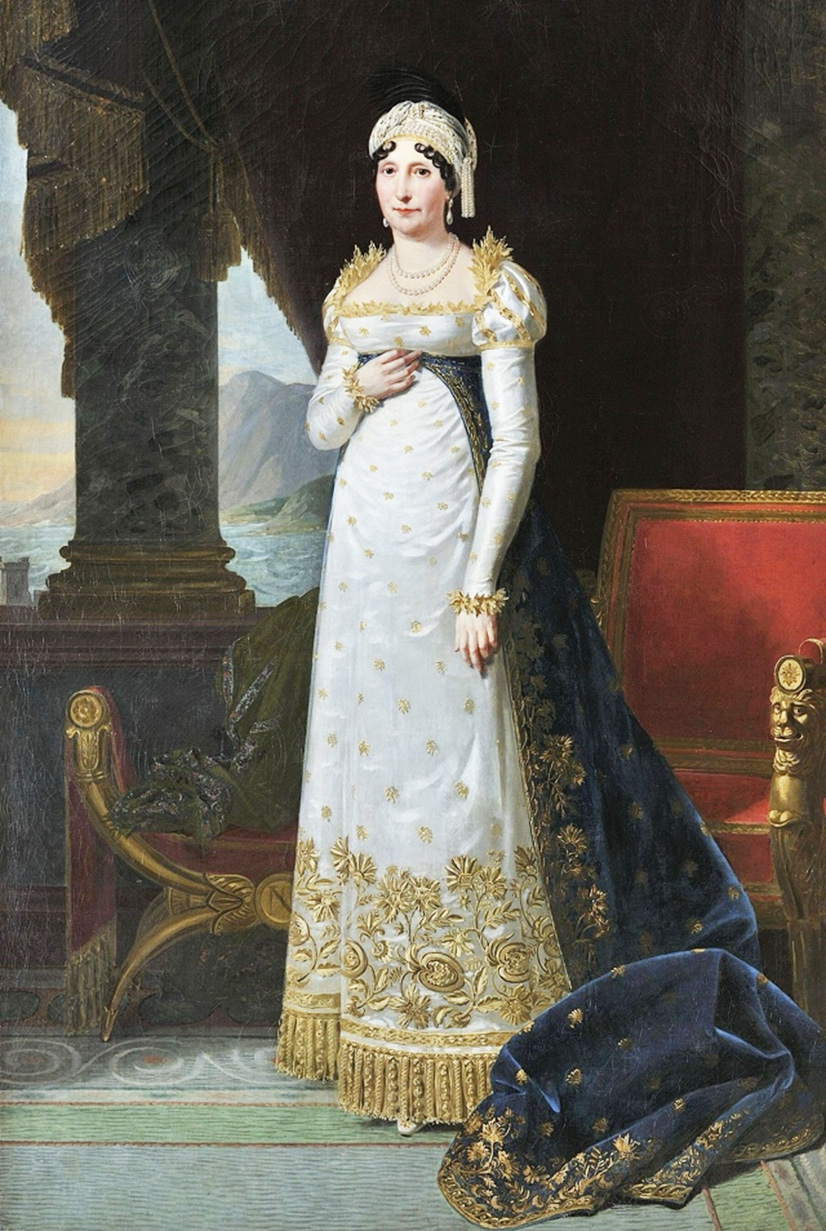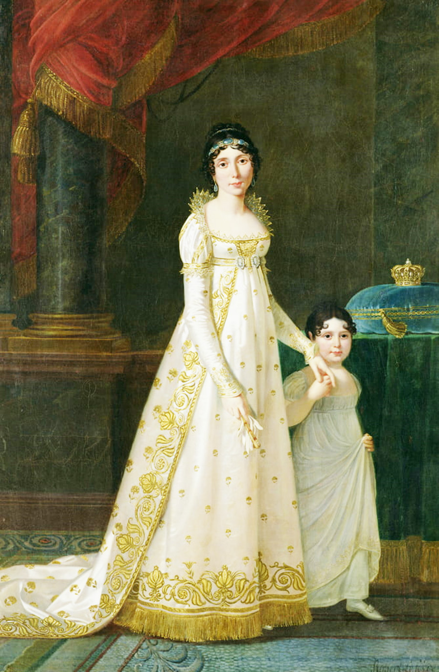 Художественная образность ампирной моды эпохи Наполеона была также представлена на картинах художников барона Р. Лефевра, Ж.Б. Изабе и др., через которые можно проследить эволюцию дамского костюма. Многообразие ювелирных украшений, обуви и причесок изображено на многочисленных портретах Жозефины Бонапарт и сестёр императора. К числу таких относится работа живописца Р. Лефевра «Портрет Полины Боргезе, урожденной Бонапарт, сестры Наполеона I» (ил. 7). Героиня одета в придворное белое платье из атласа, состоящее из лифа, юбки и трена. Вышивка на юбке платья в виде небольших цветов, гирлянд на подоле, а также на голубом трене отражает свойственные для ампира флоральные мотивы в виде стилизованных цветов и листьев. Кроме этого стоит отметить их сходство с рисунками художника по текстилю Жан-Франсуа Бони, создававшего эскизы для лионских мануфактур. Происхождение подобной вышивки, а также традиции украшать край юбки платья широкой золотой бахромой берет свое начало с коронационной туники императора Наполеона, которую можно увидеть на картине Ф. Жерара «Портрет Наполеона Бонапарта» (ил. 8). Подобная вышивка на женских придворных платьях есть и в работах кисти Р. Лефевра, в том числе картинах «Портрет Мари-Жюли Клари, королевы Неаполя, с дочерью Зинаидой Бонапарт» (ил. 9) «Портрет Летиции Бонапарт» (ил. 10). Скрупулезная прорисовка платьев членов семьи Бонапартов и приближенных ко двору, бесспорно, была рекламой достижений лионских мануфактур, а пояс, брошь, серьги, две диадемы и другие украшения и аксессуары отражали мастерство французских ювелиров.