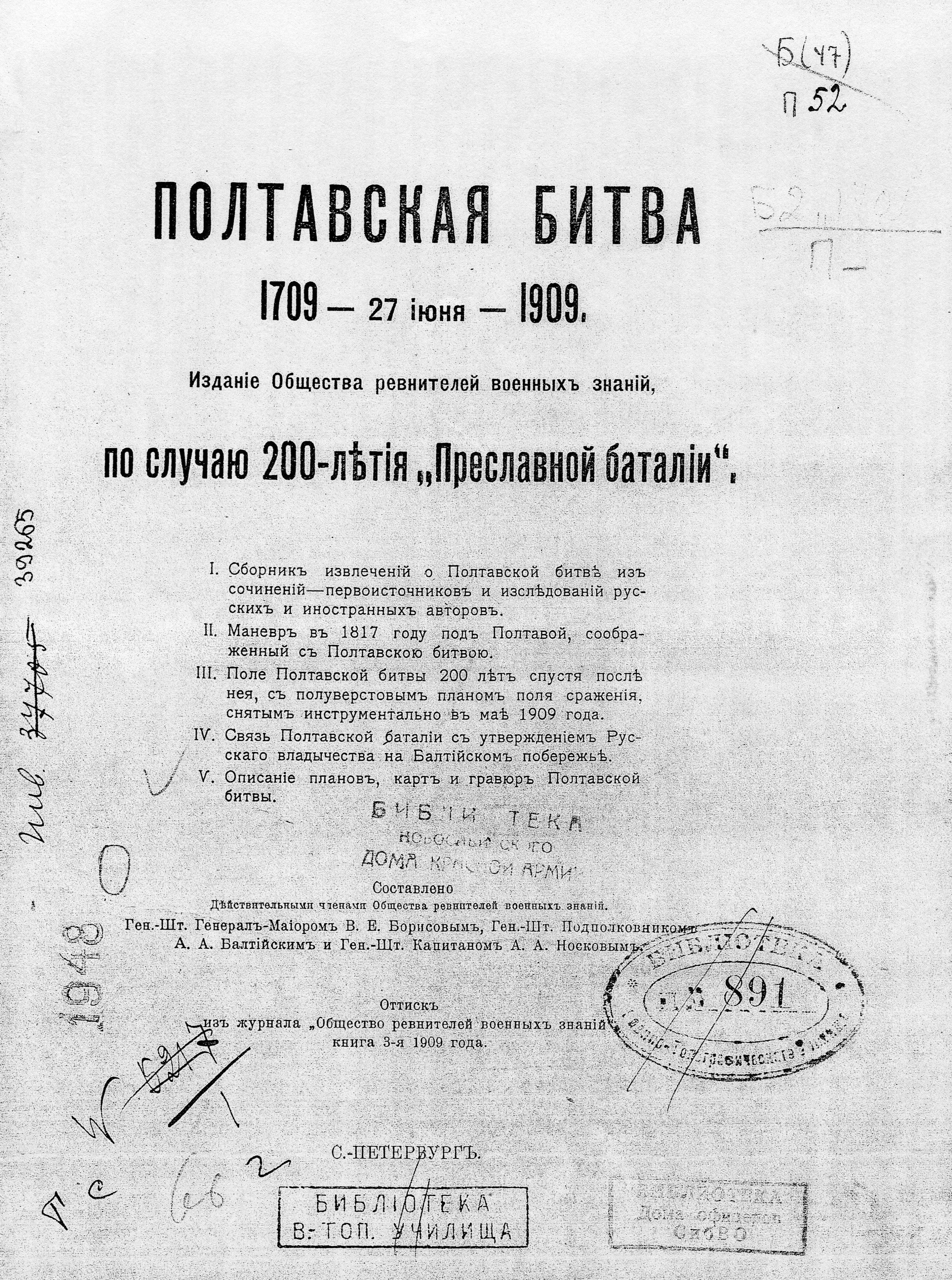 Рис. 2. Титульный лист. Полтавская битва 1709 – 27 июня – 1909. Изд. Общества ревнителей военных знаний, по случаю 200-летия «Преславной баталии». СПб., 1909. 283 с.