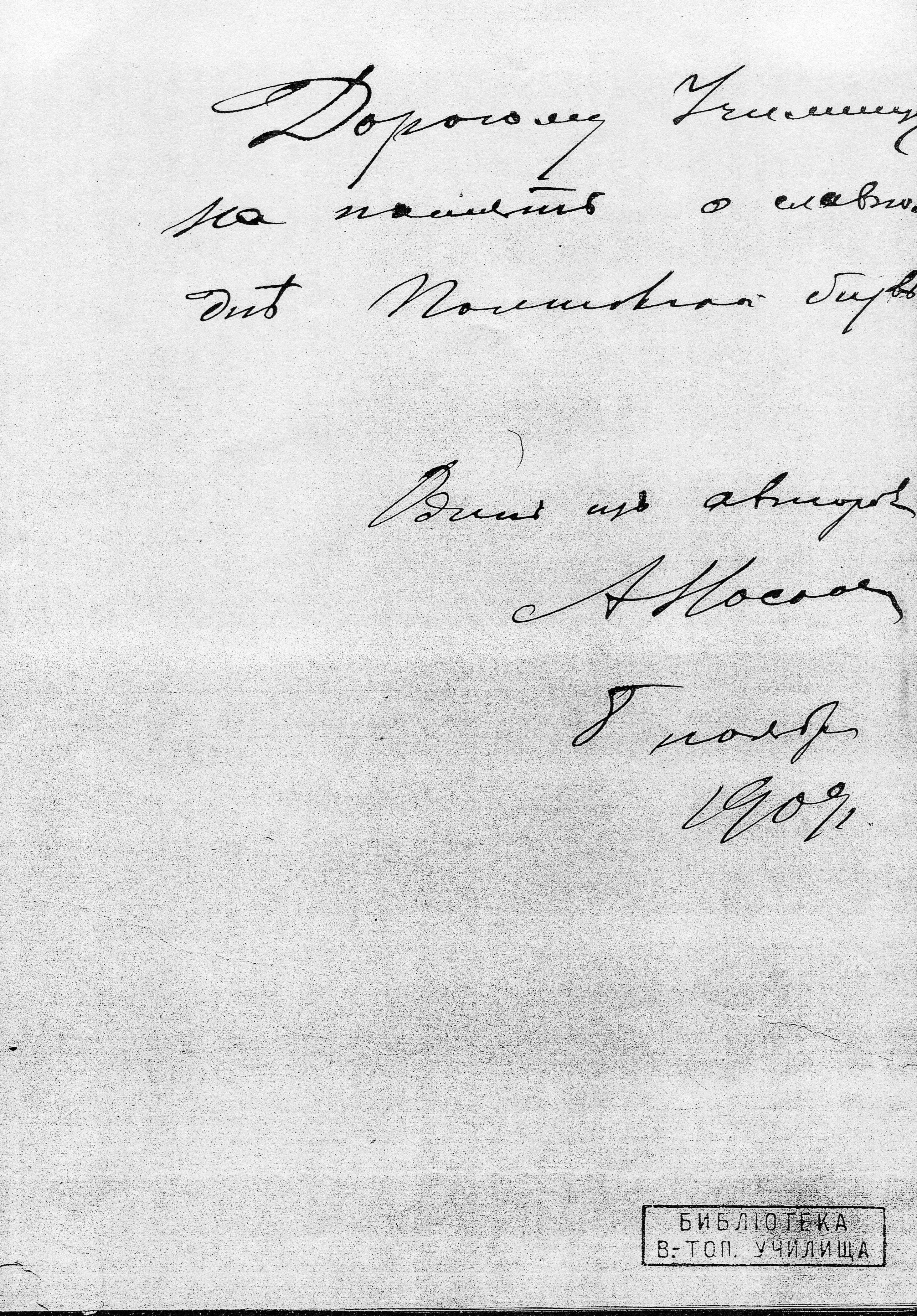 Еще одним дарителем книги для библиотеки ВТУ был выпускник (1894-1896) и преподаватель училища (1912-1915), действительный член «Общества ревнителей военных знаний» капитан А.А. Носков. В книге есть его дарственная надпись: «Дорогому училищу на память о славном дне Полтавской битвы. Один из авторов А. Носков 8 ноября 1909 г.».
