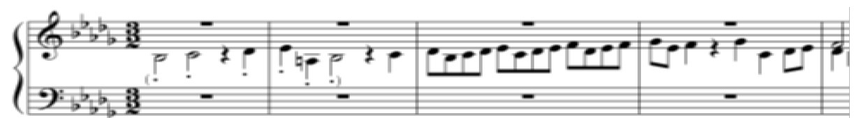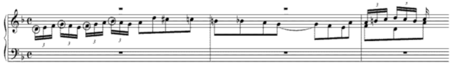 В теме фуги ре минор воплощается характерное для полифонического тематизма прежде всего органных фуг И.С. Баха (например фуги g-moll BWV 578) «развитие ритмического движения» [13, с. 146]. Постепенное измельчение длительностей начинается уже при секвенционном повторении заглавного мотива темы. Учащение ритмического пульса продолжается во втором и третьем мотивах, однако и здесь можно усмотреть баховский принцип движения от более яркой ритмической фигуры к более нейтральной: второй элемент темы приобретает черты танцевальности благодаря ритмической фигуре «восьмая – две шестнадцатые», тогда как ритм третьего элемента обладает бо́льшей ровностью, что характерно для завершающих элементов баховских тем.