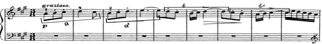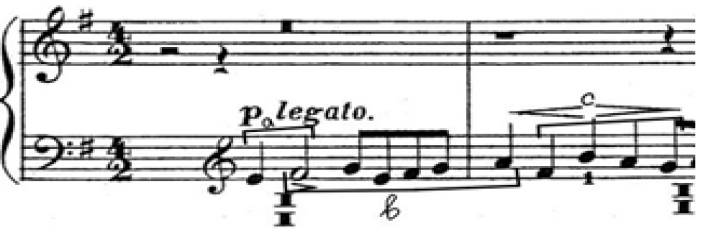 Мотив «в» по своему мелодическому контуру и отчасти ритмическому рисунку обнаруживает связь с интонацией, взятой Бахом за основу канонической секвенции в интермедиях-эпизодах фуги h-moll из I тома «Хорошо темперированного клавира». Заметим, что в данной фуге Римский-Корсаков и сам использует этот мотив в качестве тематической основы канонической секвенции в первой же интермедии. Однако если в фуге Баха эти контрастные основному материалу фуги интермедии-эпизоды, строящиеся на непроизводных от темы интонациях, в сочетании с характерной тональной рифмой демонстрируют уникальный пример проявления в композиции барочной фуги черт классической сонатности, то в образце, принадлежащем перу русского композитора, проявляется более традиционная для фуг Баха ситуация мотивного вычленения как принципа развития в интермедиях. Стоит отметить, что интонационное сходство тематического материала интермедий фуги A-dur с интермедиями последней фуги из I тома «Хорошо темперированного клавира» – одной из любимых, по воспоминаниям В. Ястребцева, Римским-Корсаковым3 – обнаружил Б. Сабанеев [14, с. 359].