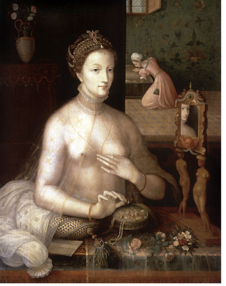 В Италии к тому периоду жанр обнаженного портрета уже давно вошел в моду. Дабы оправдать обнаженность, портретируемые нередко изображались в образах мифологических, легендарных или исторических персонажей, для которых нагота являлась естественным состоянием: так, к примеру, Аньоло Бронзино пишет аллегорические портреты адмирала Андреа Дориа в образе Нептуна (Пинакотека Брера, Милан) и Козимо Медичи в образе Орфея (Художественный музей Филадельфии). С другой стороны, нагота является элементом образа Прекрасной Дамы, продиктованного поэтической традицией, утвердившейся в произведениях Франческо Петрарки, Пьетро Бембо, Серафино Аквилано и др. Этот идеал получил воплощение в картине Джованни Беллини «Молодая дама за туалетом» из венского Музея истории искусств, «Форнарине» Рафаэля (Палаццо Барберини, Рим), переиначившего на современный лад античный тип Venus Pudica, многочисленных интерпретациях «Donna Nuda» или «Mona Vanna» Леонардо. Джулио Романо, очевидно, вдохновляясь произведением Рафаэля, написал свой вариант «Форнарины» – «Даму за туалетом» (ГМИИ им. А.С. Пушкина, Москва), и именно данный сюжет – молодая обнаженная дама, сидящая перед зеркалом на фоне роскошных покоев, – слившись с иконографией «Моны Ванны», стал во Франции наиболее популярным.