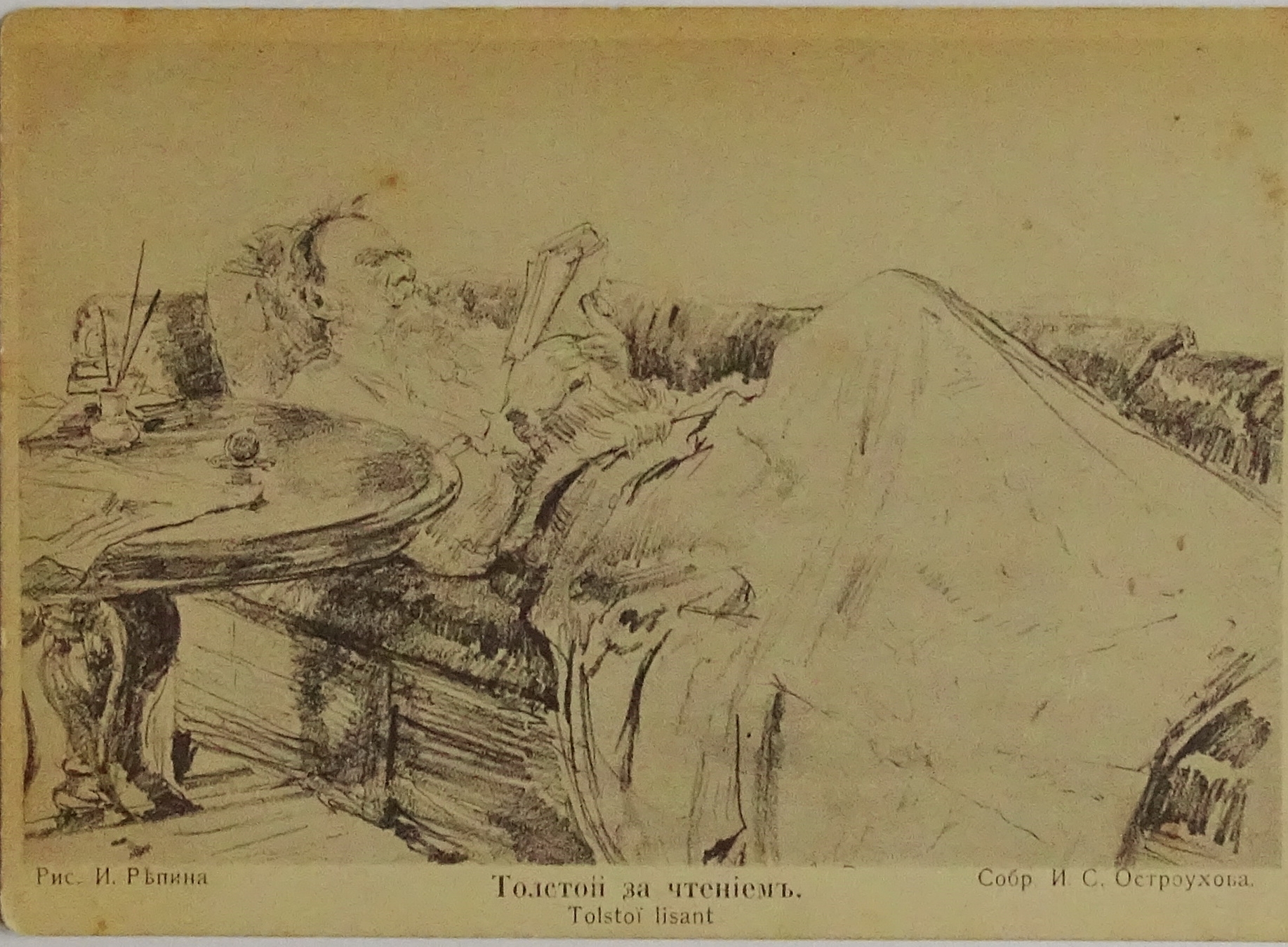 Ил. 13. И.Е. Репин. Толстой за чтением. 1891. Бумага, карандаш. Открытка. Издание Общины Святой Евгении Красного Креста. Москва. Частное собрание