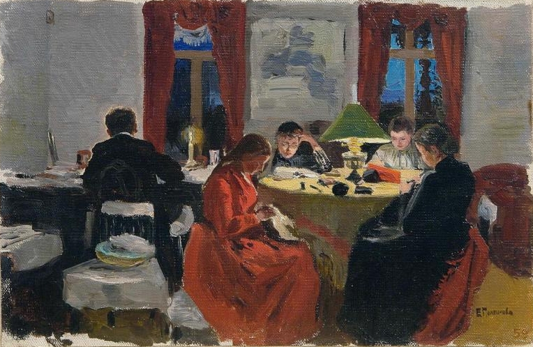 Изменились и картины семейного чтения – теперь это реалистические изображения близких людей, занятых общим делом, где каждый изображен в своих духовных переживаниях о прочитанном. Классическим произведением в этом смысле можно назвать знаменитую картину В.И. Сурикова (1848–1916) «Меньшиков в Березове» (1883, ГТГ). Интересные изображения семейного чтения как повседневного занятия оставила замечательная художница Е.Д. Поленова (1850–1898) («За чтением. Нельшевка. На даче Антиповых». Этюд. 1889) (ил. 14).
