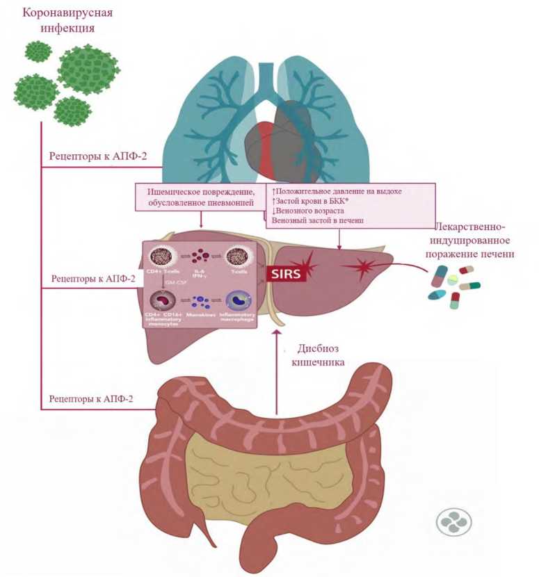 Этиология поражения печени при COVID-19 многогранна и может включать прямое цитопатическое действие вируса на гепатоциты и холангиоциты, иммунное воспаление в рамках системного воспалительного ответа, гипоксию органа, применение лекарственных препаратов с потенциальными гепатотоксичными эффектами. Несмотря на то, что повреждения печени, ассоциированные с COVID-19, как правило, преходящие и хорошо обратимы при своевременном выявлении и коррекции, клиницистам необходимо помнить и о возможном дебюте ранее не диагностированного или обострении уже имеющегося заболевания печени.