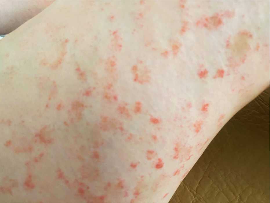 Рис. 2 Проявления капиллярита и остаточные явления розового лишая на поверхности бедра пациентки В