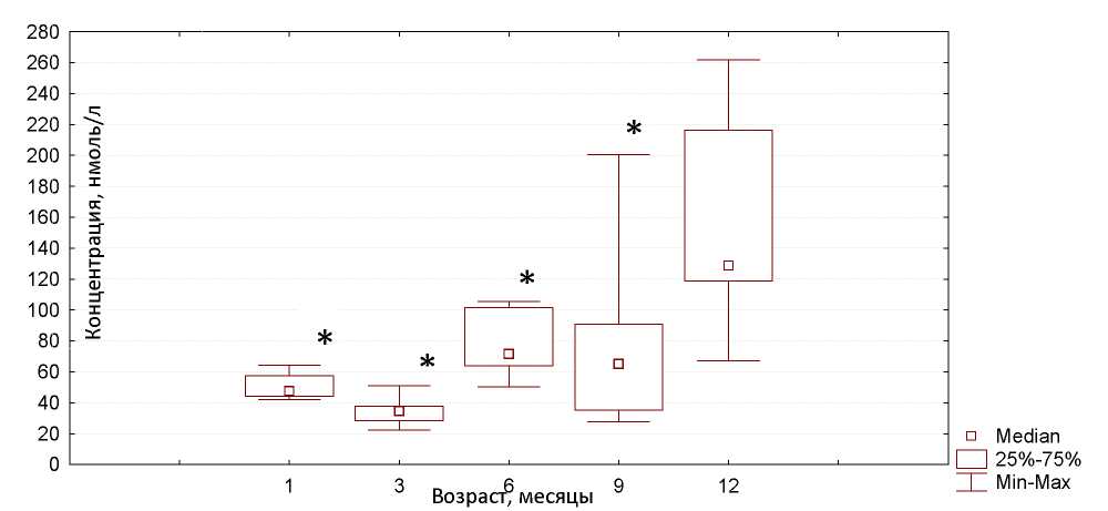 Основные показатели ферментативного звена антиоксидантной системы – глутатионредуктаза и супероксиддисмутаза находятся в возрастном диапазоне с 1-го по 12-й месяцы примерно на одном уровне (табл.1).