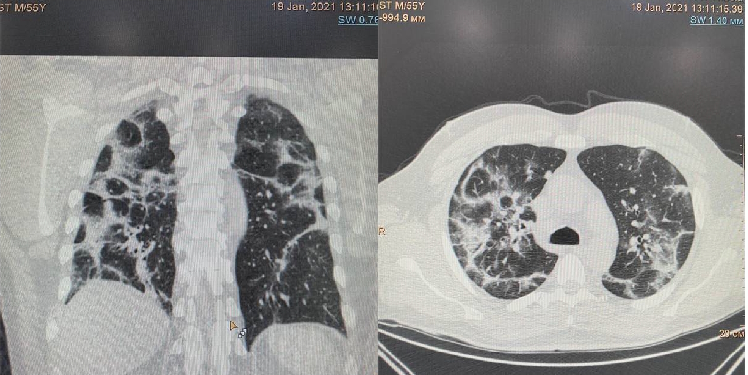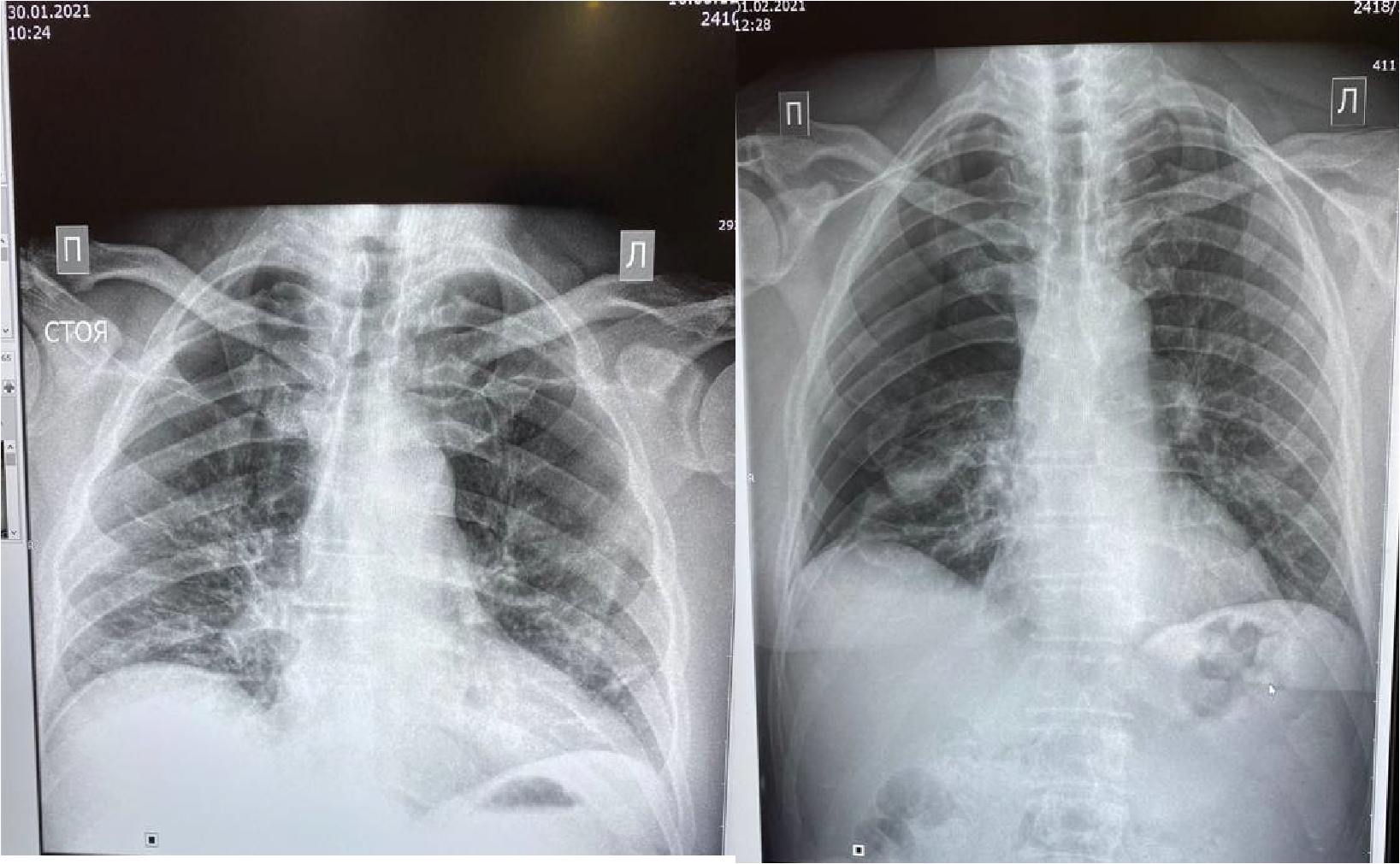 Рост пациента - 173 см, масса тела - 101 кг, ИМТ - 33,7 кг/м2. Температура тела - 370С, частота дыхательных движений (ЧДД) - 23 в минуту, АД - 130/80 мм рт. ст., пульс - 72 уд/мин, SpO2 - 94%. В нижних отделах легких выслушивались крепитирующие хрипы, баллы по шкале NEWS - 4. Имевшаяся сопутствующая патология включала ИБС, постинфарктный кардиосклероз (инфаркт миокарда 2001, 2016 гг.), артериальную гипертензию, ХСН IIa, ФК II, атеросклероз, антифосфолипидный синдром, подтвержденный волчаночным антикоагулянтом, ожирение I степени. Пациент не имел хронических заболеваний бронхолегочной системы, никогда не курил. Анализы при поступлении: Д-димер 37,6 нг/мл, лактат 2,49 ммоль/л, СРБ 20 мг/л; в общем анализе крови снижение лейкоцитов, нейтрофилов, лимфоцитов (2,76х109/л (5,00-10,5 х109/л); 1,63 х109/л (2,0-7,5 х109/л), 0,81 х109/л (1,3-4,0 х109/л), соответственно). Начальная терапия включала фавипиравир, парацетамол, витамин С, фраксипарин, дексаметазон, гипотензивные и гиполипидемические средства (периндоприл, бисопролол, розувастатин, фенофибрат), УДХК, омепразол, спиронолактон, эластическое бинтование ног, инсуффляцию кислорода. Рекомендованную пронпозицию пациент соблюдал неохотно.