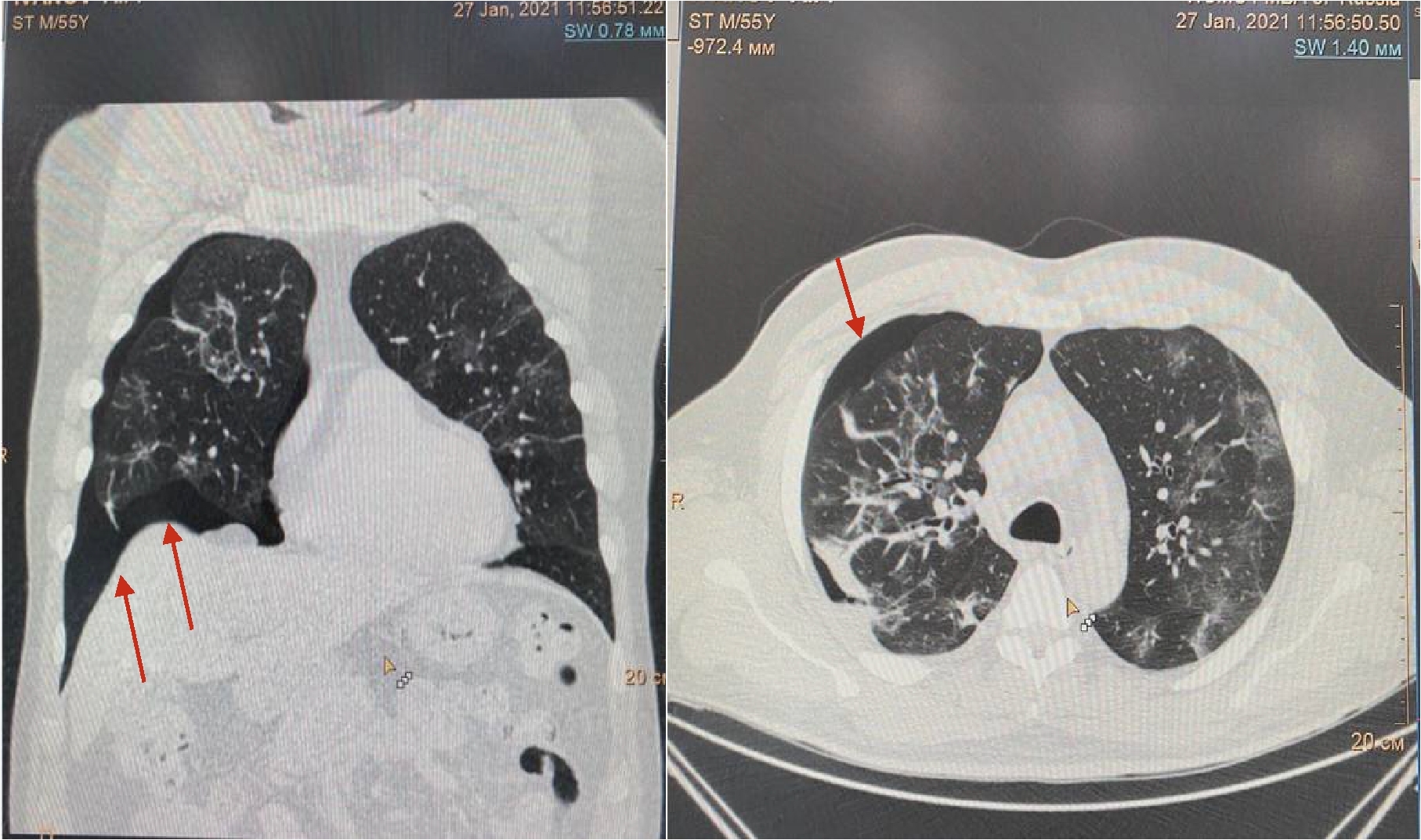 4. Figure 3. MSCT of the chest - signs of bilateral polysegmental interstitial pneumonia (volume of lesion 30%, CT-2). Medium right-sided pneumothorax (red arrows).