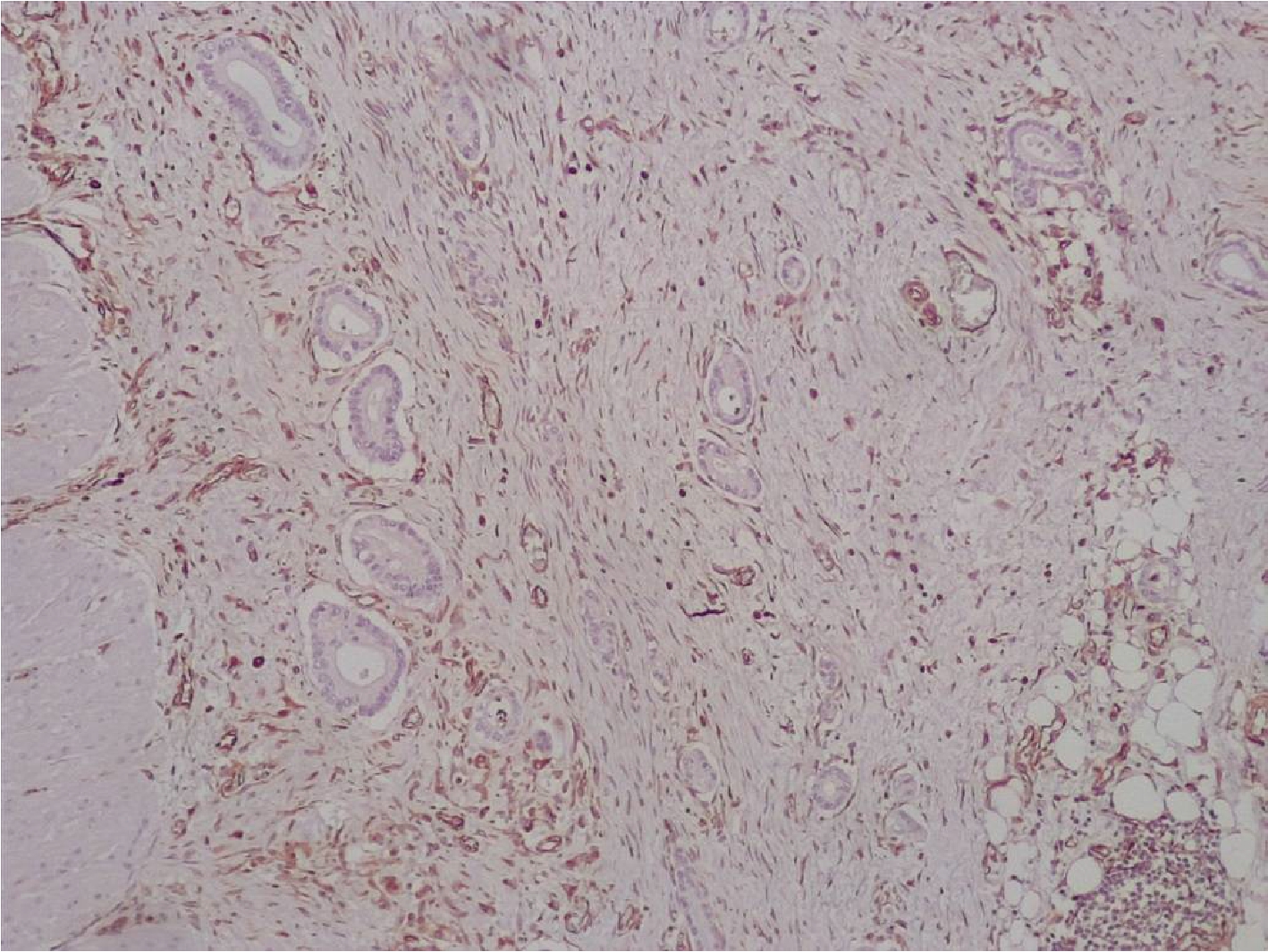 Рис.3. Строма аденокарциномы тонкой кишки с нейроэндокринным компонентом представлена немногочисленными тонкими коллагеновыми волокнами. Иммуногистохимическое исследование с антителами к виментину. Увеличение Х200.