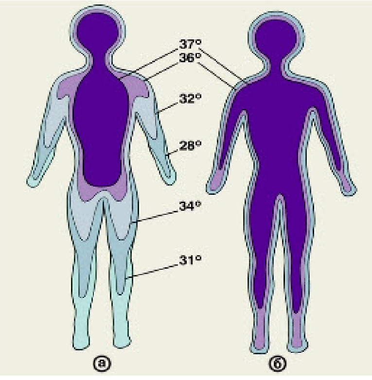 Пол и температура тела. Закономерность, связанная с полом человека, наблюдаются в многолетнем исследовании по физиологии Т.С. Прониной: у девочек от 8 до 17 лет средняя температура (мезор) кожи плеча выше, чем у мальчиков данной возрастной группы; у взрослых людей 20–22 лет мезор выше у юношей [12].