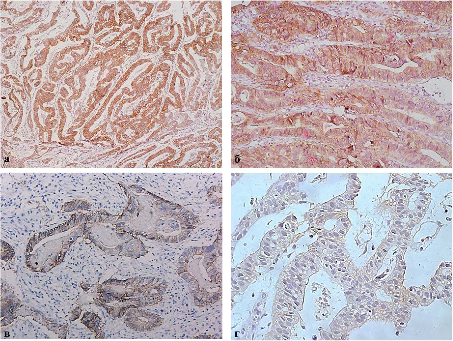 Рис. 1. ИГХ-экспрессия HER2: инвазивная карцинома, 3+ (а – биоптат слизистой оболоч-ки желудка, х10; б - биоптат слизистой оболочки желудка, х20, в – биоптат слизистой оболочки желудка, х10); дисплазия высокой степени, подозрительная в отношении инва-зивной карциномы, очаговая экспрессия 1+ (г – биоптат слизистой оболочки желудка, х40)